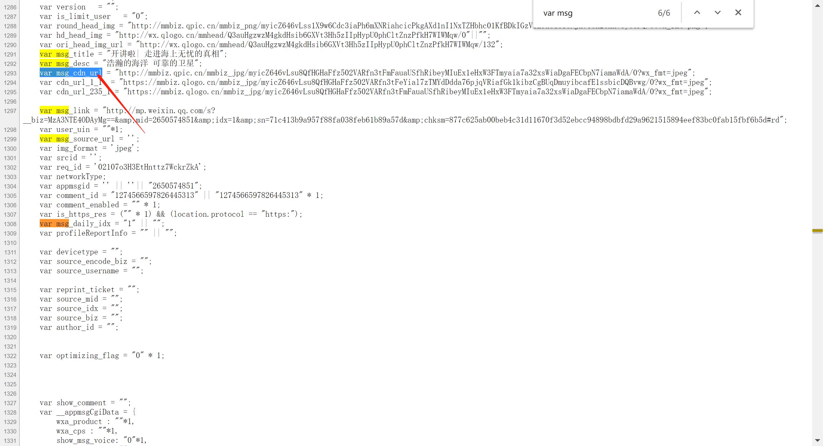 3.其中,var msg_cdn_url 对应的链接就是要找的图片的链接,打开新的页面复制此链接即可下载。